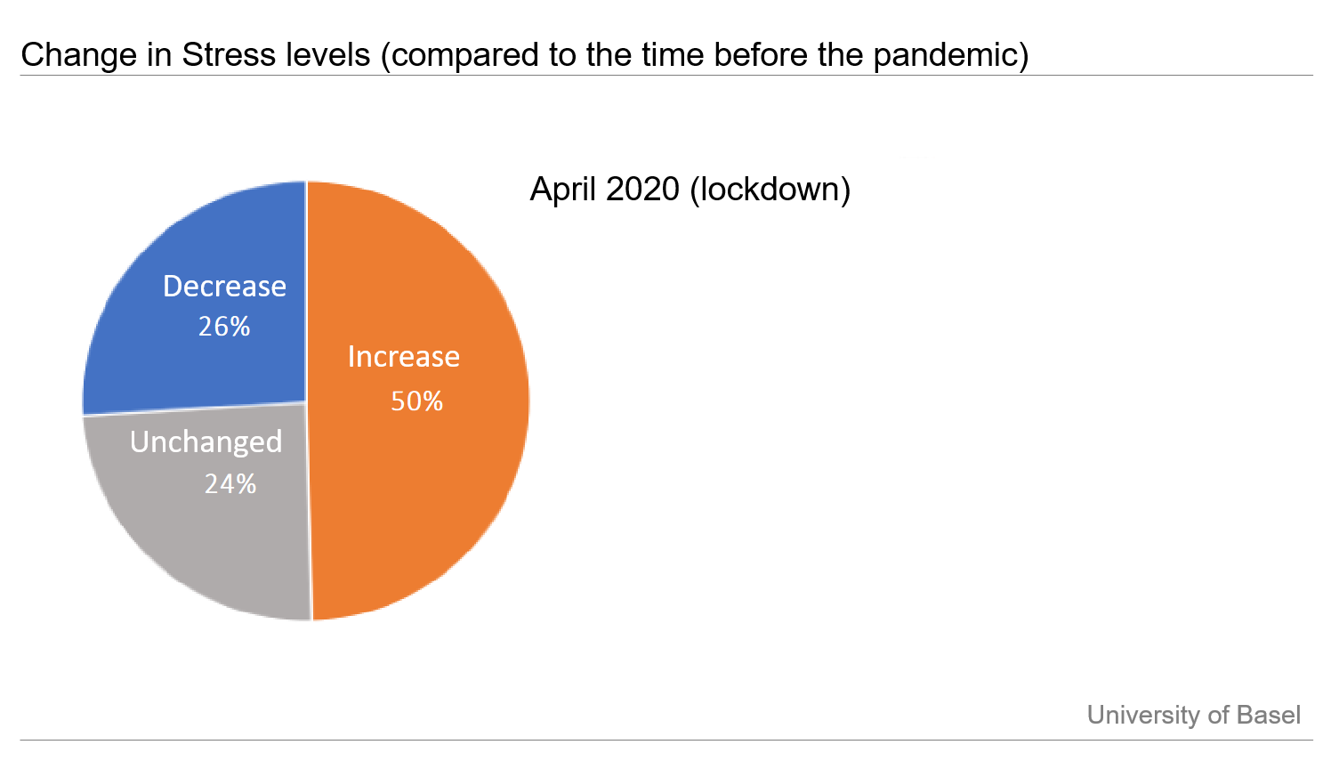 I primi risultati provengono da un sondaggio che analizza il periodo 6-8 aprile 2020 - tre settimane dopo l'annuncio del primo blocco. I dati di più di 10'000 persone hanno mostrato che quasi la metà degli intervistati si è sentita più stressata durante questo periodo, principalmente a causa dei cambiamenti nel lavoro/studio e nella cura dei bambini, tra gli altri fattori. È interessante notare che il 26% degli intervistati si è sentito meno stressato, suggerendo che il blocco ha comportato una riduzione dei fattori di stress e/o più tempo per il recupero. I cambiamenti nei livelli di stress erano anche correlati ai cambiamenti nei sintomi depressivi. Infine, diversi fattori sono stati identificati come protettivi per quanto riguarda lo stress e la depressione: attività fisica, dedicare tempo per un hobby o un progetto e consumare meno notizie relative al coronavirus.